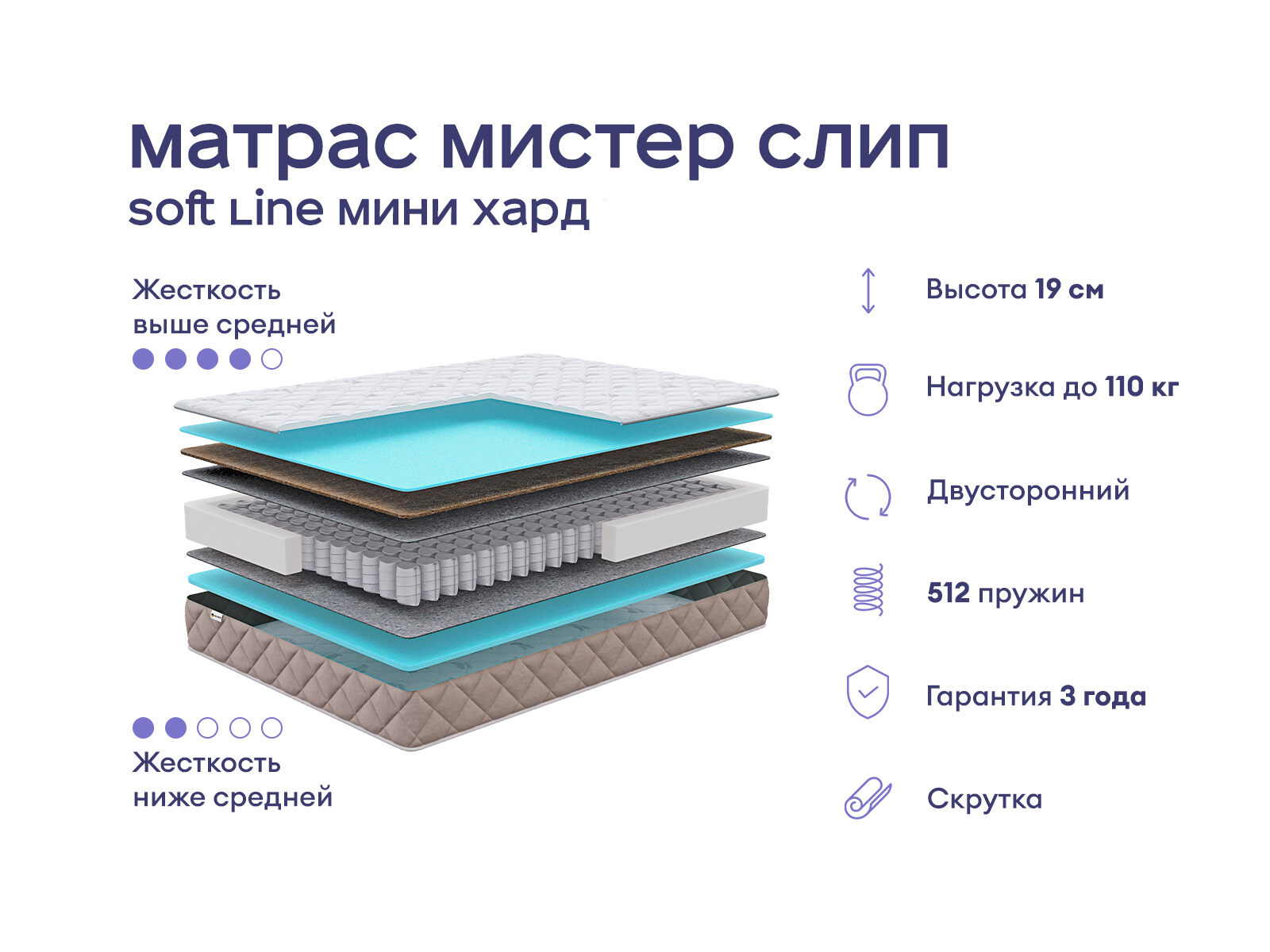 Прочный и комфортный матрас с ортопедической поддержкой. Это оптимальный выбор для тех, кто ищет удобную жёсткость и надёжную поддержку для спины. Две спальные поверхности и разный уровень жёсткости позволяет выбрать уровень комфорта. В сочетании с качественными наполнителями и усиленным пружинным блоком вы получите здоровый сон и уютный отдых.