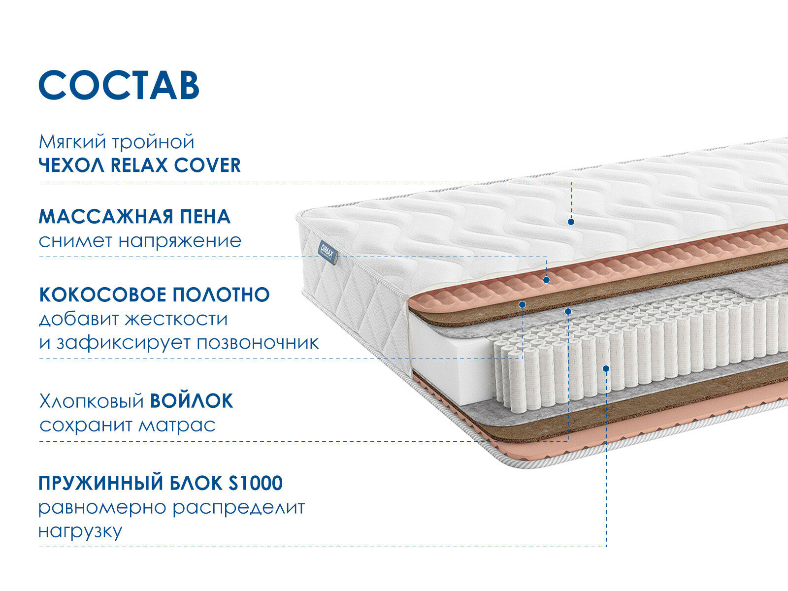 Матрас Димакс Relmas Cocos S1000 – это модель с одинаковой жёсткостью сторон выше среднего. Она сочетает натуральные наполнители, массажный эффект и усиленный пружинный блок для вашего комфортного сна.