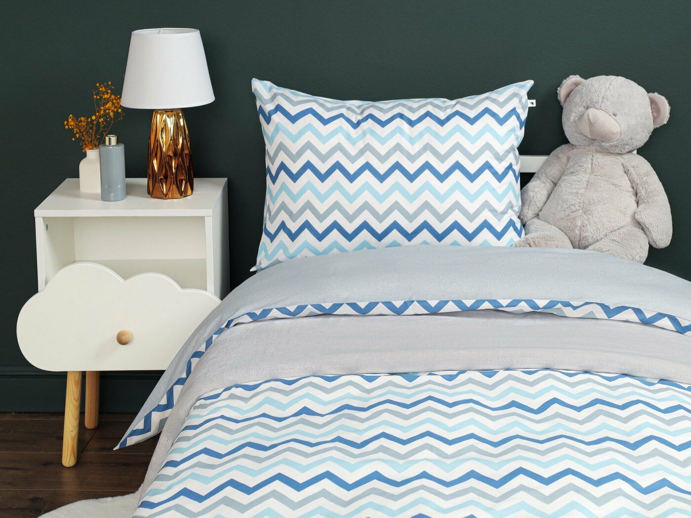 Пододеяльник –двусторонний: верх из ткани А (принтованная ткань), обратка из ткани В (однотонная рогожка), с потайной молнией.
