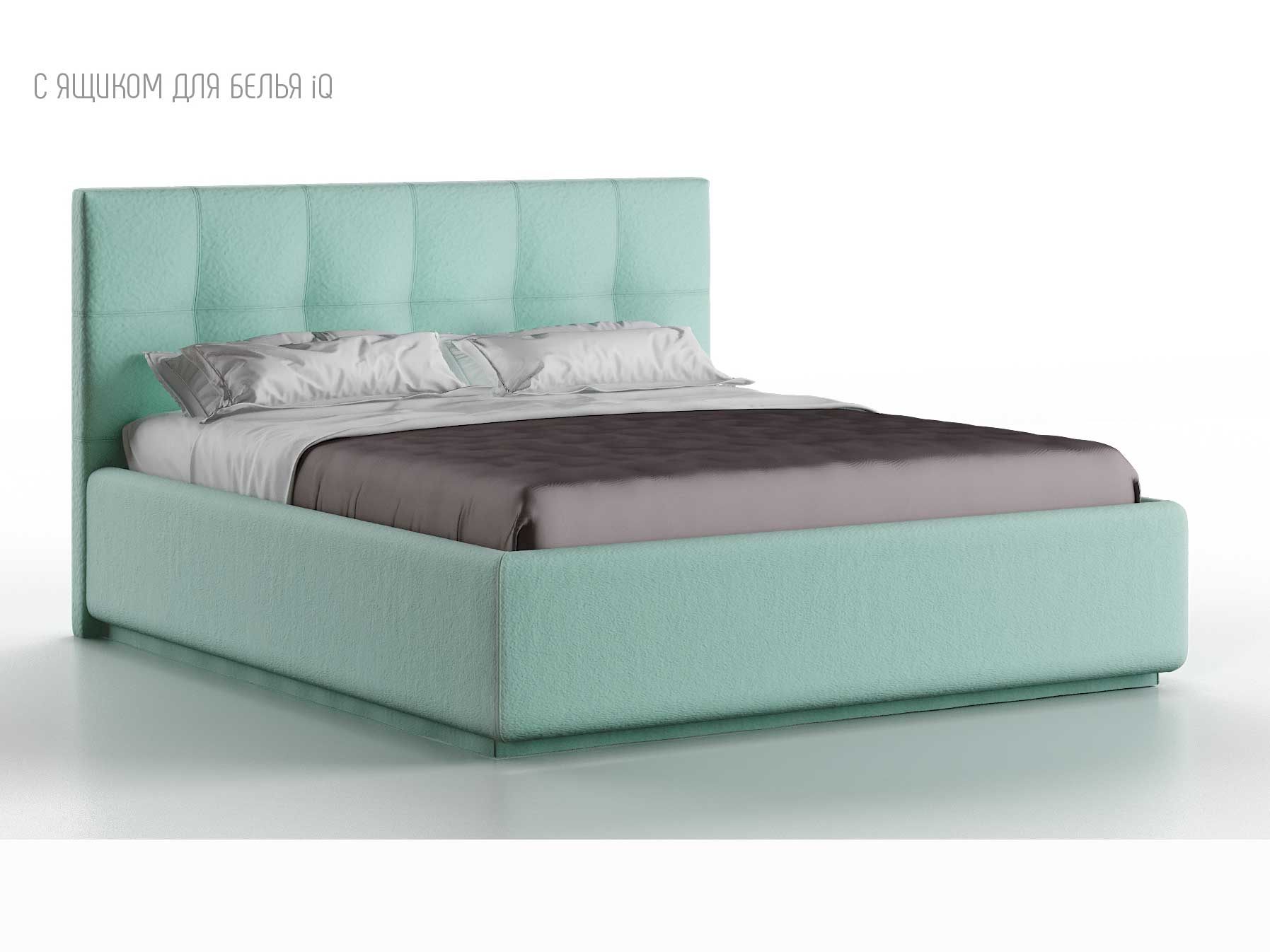 Кровать укомплектована IQ с подъемным механизмом и ящиком для белья без дна (дополнительная платная опция - дно к ящику IQ из HDF (ХДФ). Каркас кровати на цоколе, декоративный чехол на цоколе съёмный. Глубина ящика для белья - 30 см, без ограничения нагрузки на ящик.