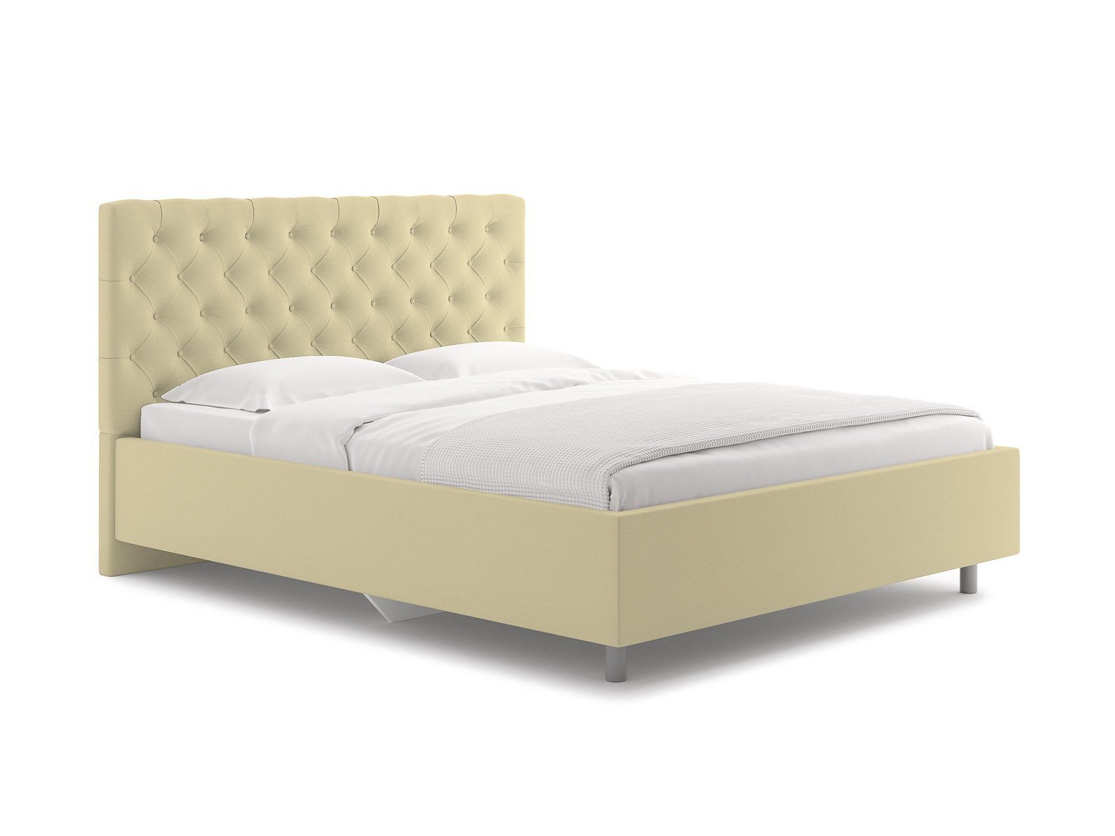 Элегантная интерьерная кровать с изголовьем, украшенным декоративными пуговицами и глубокой пиковкой. Модель изготовлена из ДСП.