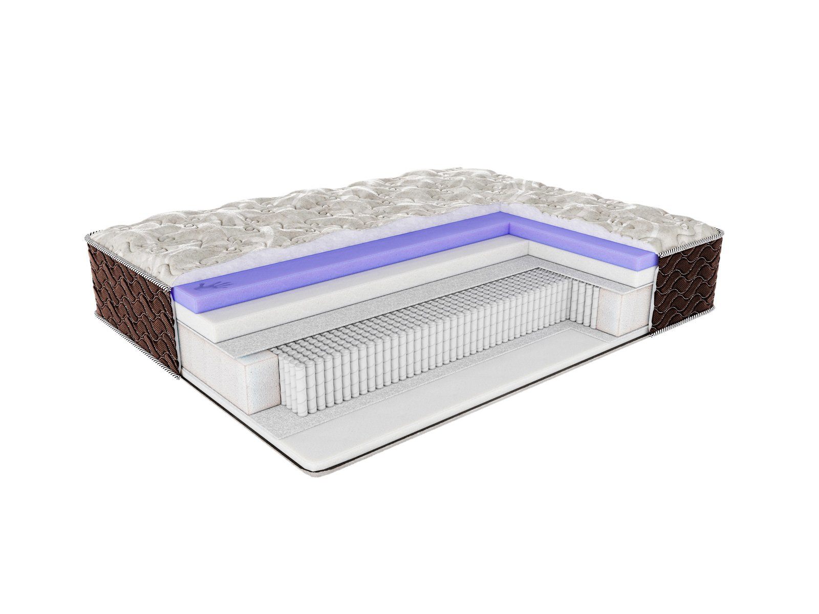 Чехол: несъёмный, из плотной трикотажной ткани с содержанием льна, простёган на искусственном волокне Холлкон (200 гр) и 0,8 см пены - пышность и объём. Бурлет матраса выполнен из плотного мебельного жаккарда шоколадного цвета, простёганного на ППУ 1 см — усиление периметра, сохранение геометрии матраса на протяжении всего срока службы.