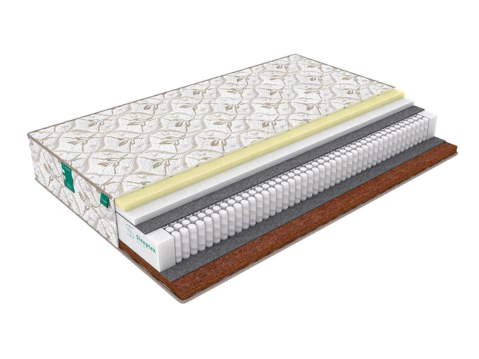 Жесткость сторон матраса различна. Одна сторона обладает высокой жесткостью, так как проложена слоем кокосовой койры. Кокос придает поверхности жесткость и усиливает ортопедичность пружинного блока.
