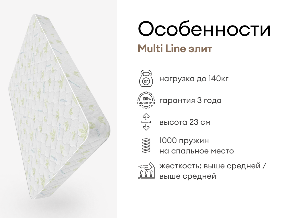 Мистер Слип Multi Line элит сочетает умеренную жёсткость с надёжной поддержкой, обеспечиваемой качественными наполнителями и независимым пружинным блоком. Сбалансированная конструкция выдерживает нагрузку до 140 кг на спальное место и подходит для комфортного сна в любой позе.