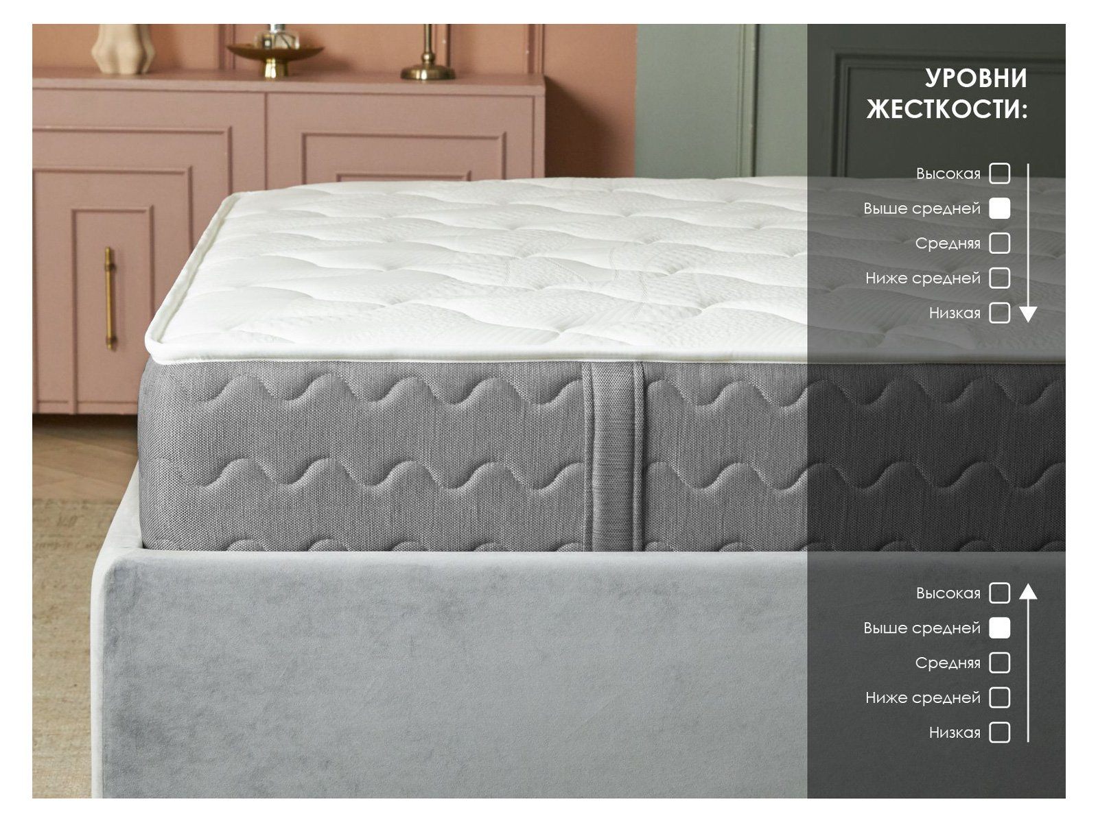 Матрас сочетает разное наполнение по сторонам, сохраняя единый уровень жёсткости, и использует зонированный пружинный блок для точечного распределения нагрузки.