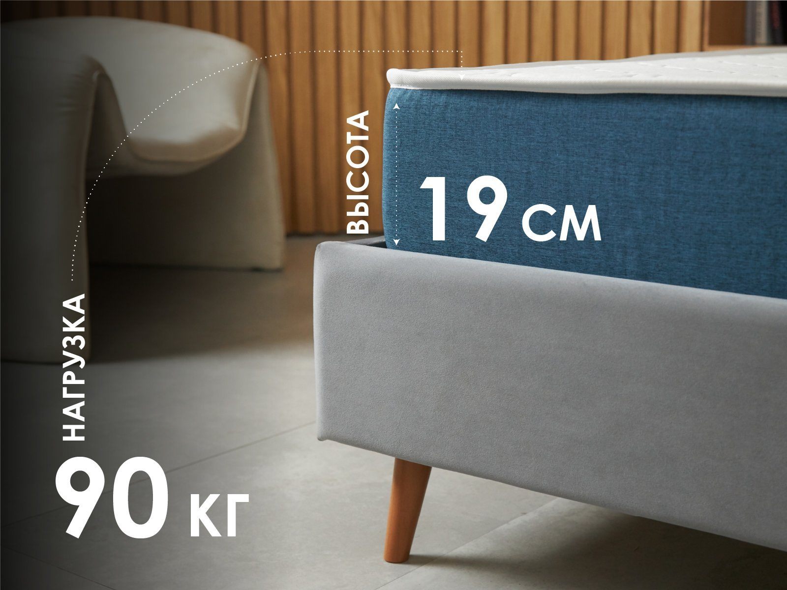 Рекомендованная нагрузка для модели – 90 кг на спальное место, толщина изделия – 19 см.